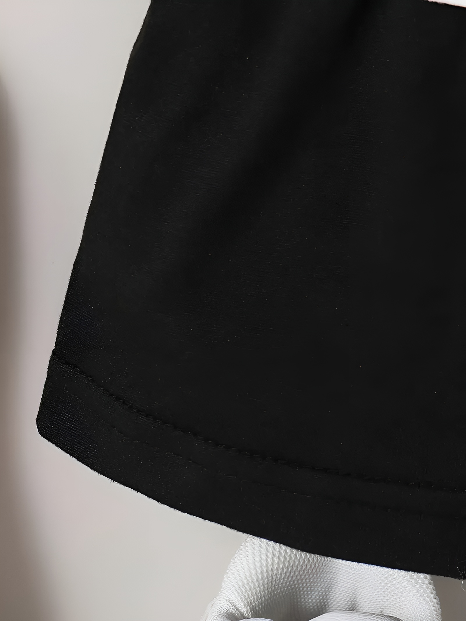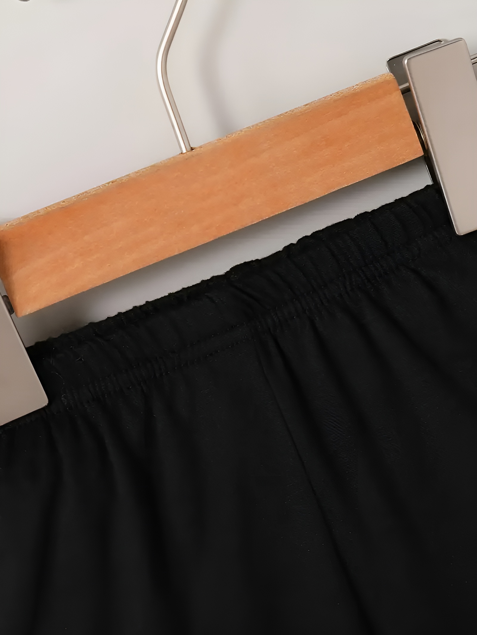 The balanced black-and-white color combination provides a clean, contemporary appearance. The shorts fit comfortably with an elastic waistband, ensuring ease during movement or play. The overall design makes it adaptable to various casual settings while keeping children comfortable throughout summer activities.