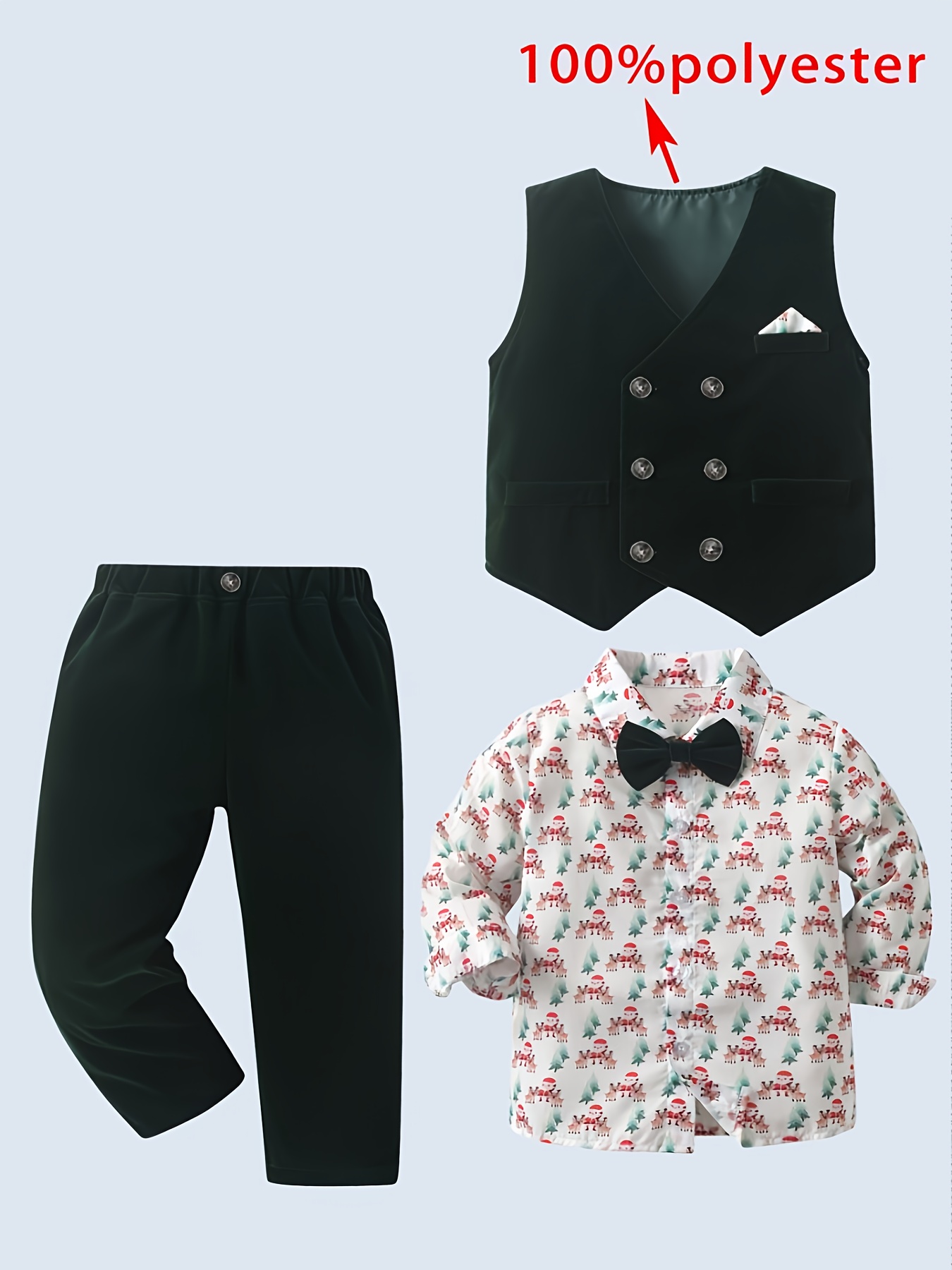 - Complete 3-Piece Set: This set includes a white long-sleeve shirt with a bow tie, a deep green velvet vest, and plaid pants—everything needed for a sharp, polished look.