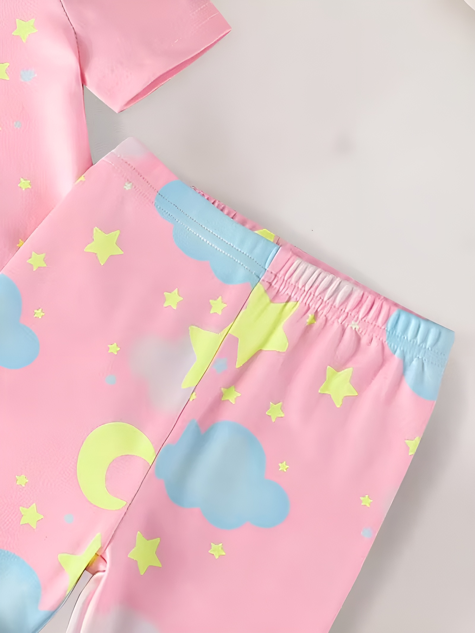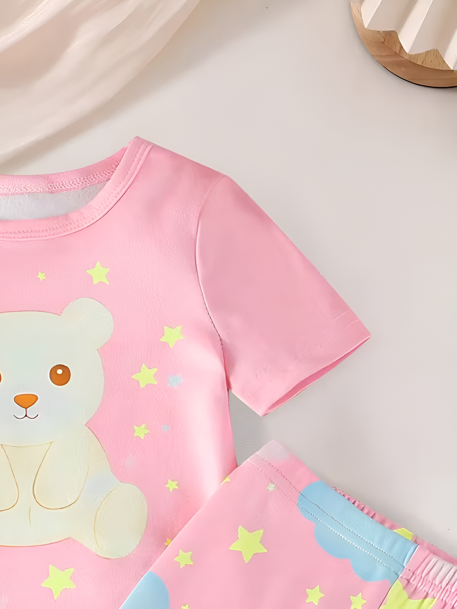 Each feature supports home routines. The Bear And Cloud Printed Short Sleeve Pajama Set For Girls aims for calm evenings and easy mornings. It suits story time, movie night, or quiet play before bed.