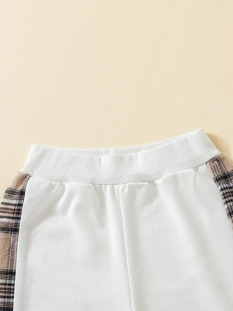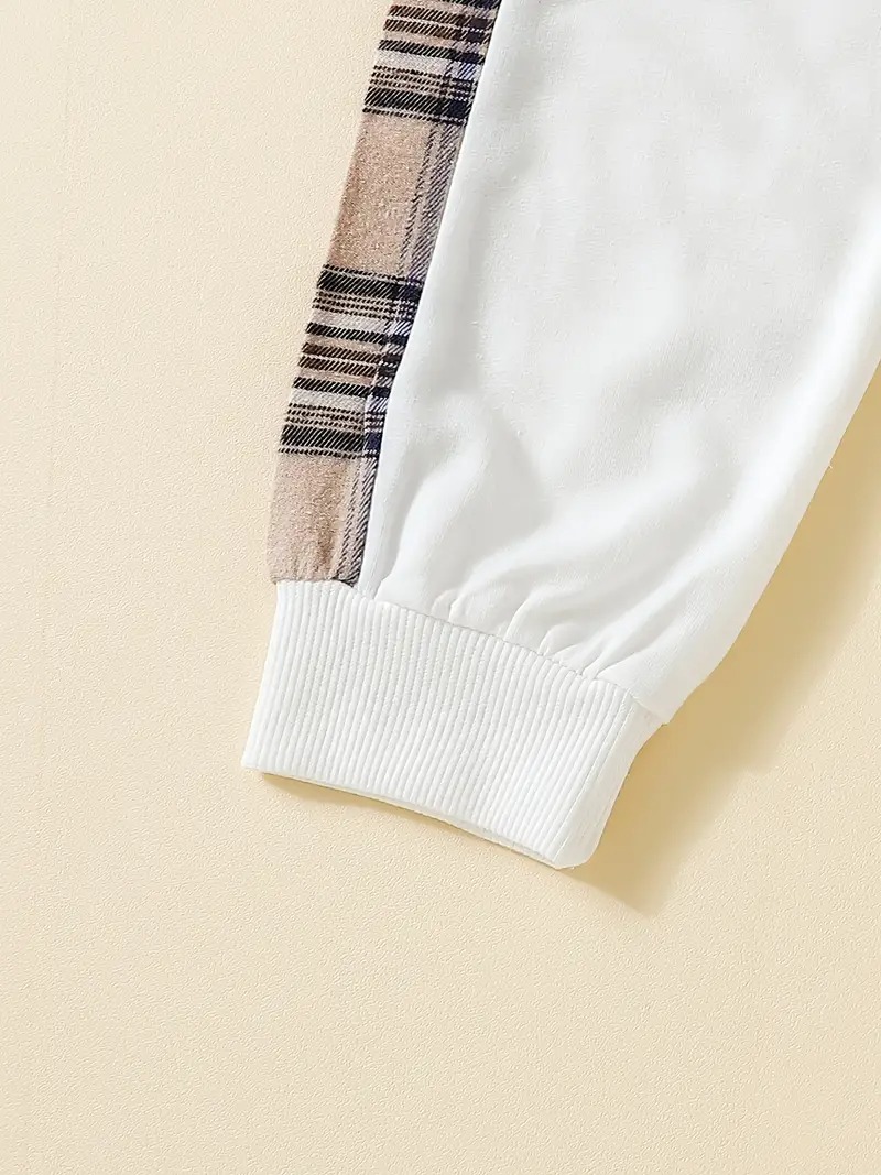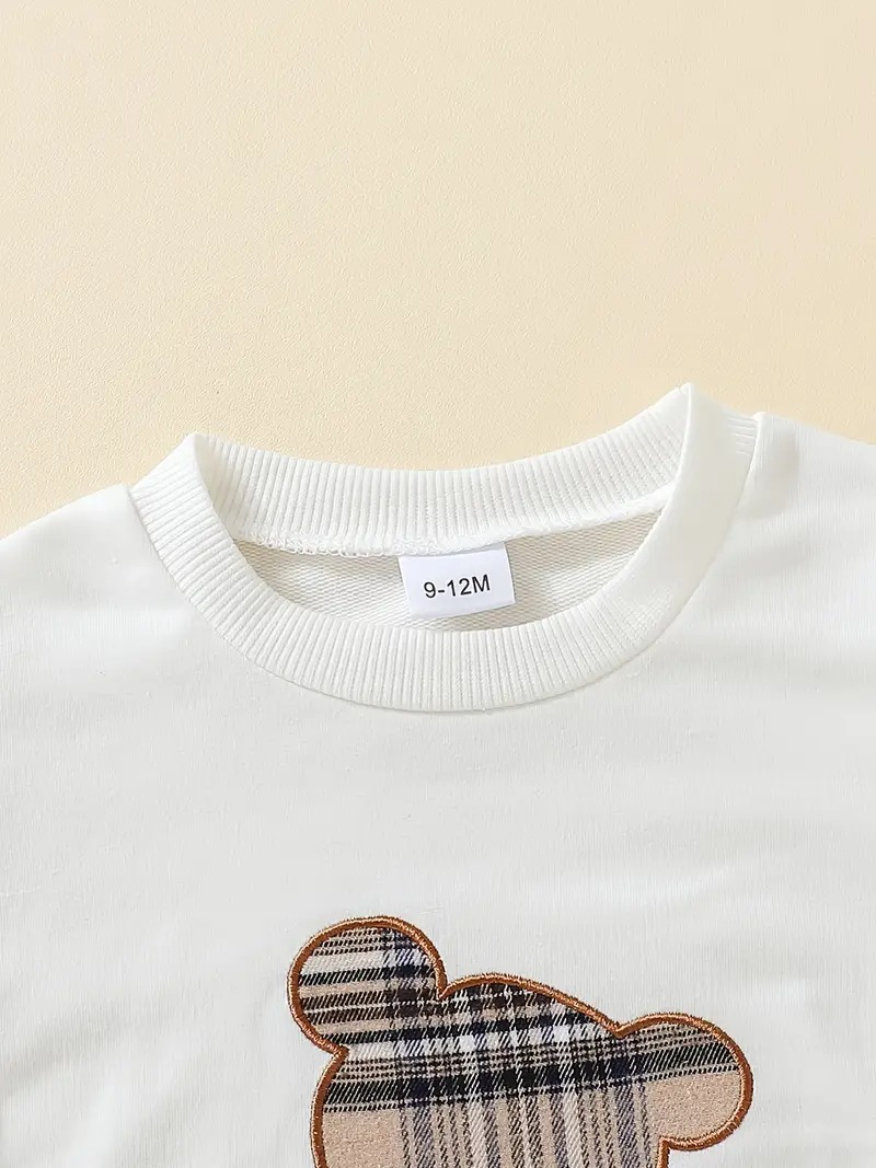 This outfit includes a sweatshirt with a bear embroidery design and matching pants with plaid side detailing. The elastic waistband and ribbed cuffs provide an easy fit, making dressing simple for both children and parents. It’s crafted to balance softness, structure, and durability while keeping a tidy appearance. The design reflects simplicity and care, suitable for play, school, or family time during cooler months.