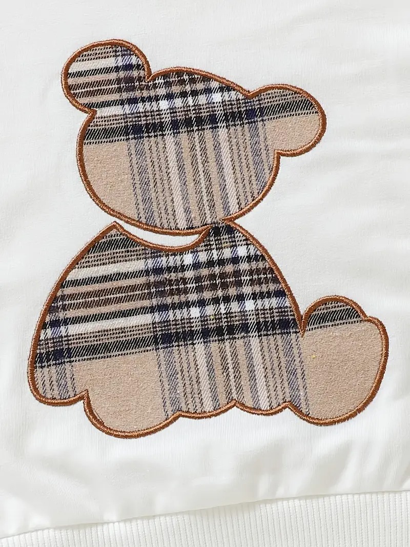 - Plaid Splicing Detail: Plaid inserts on the pants create a subtle coordinated look with the bear embroidery.