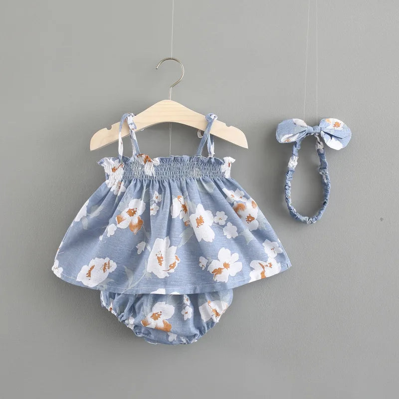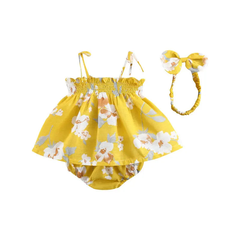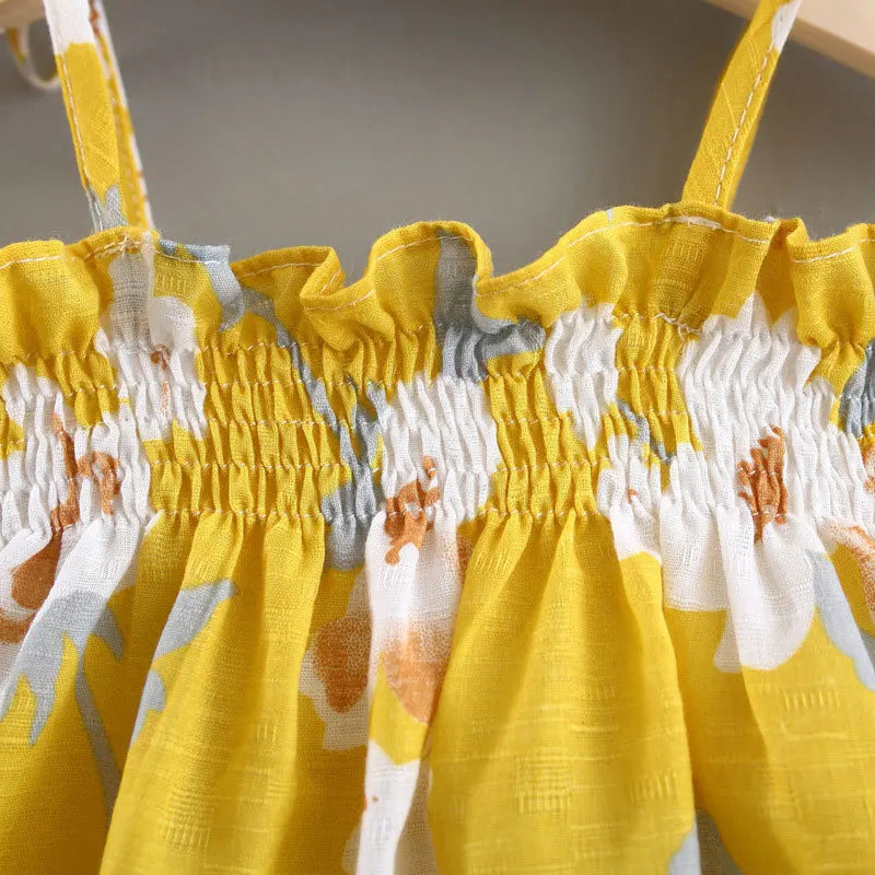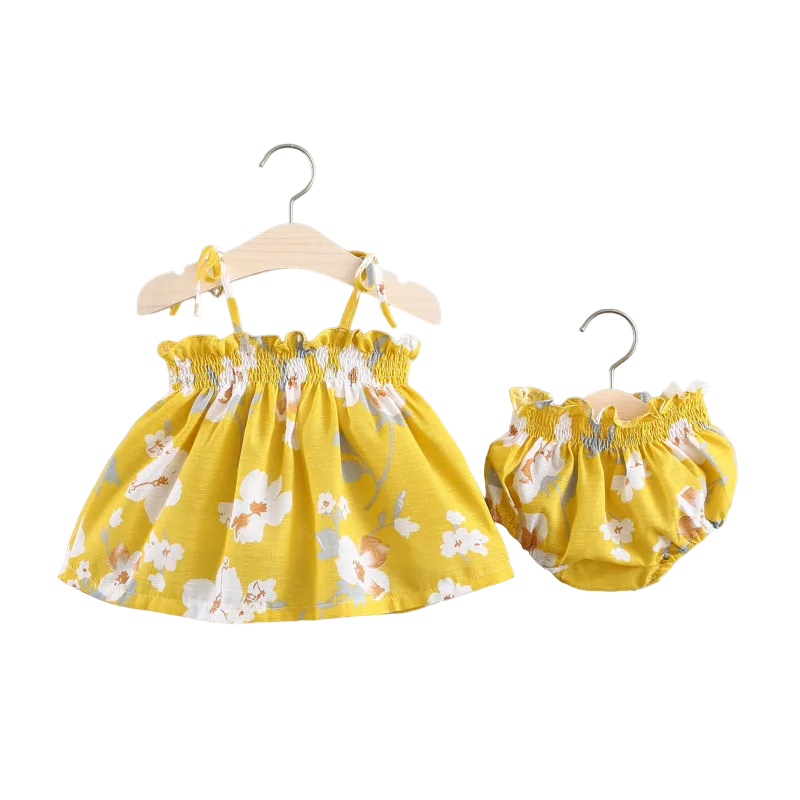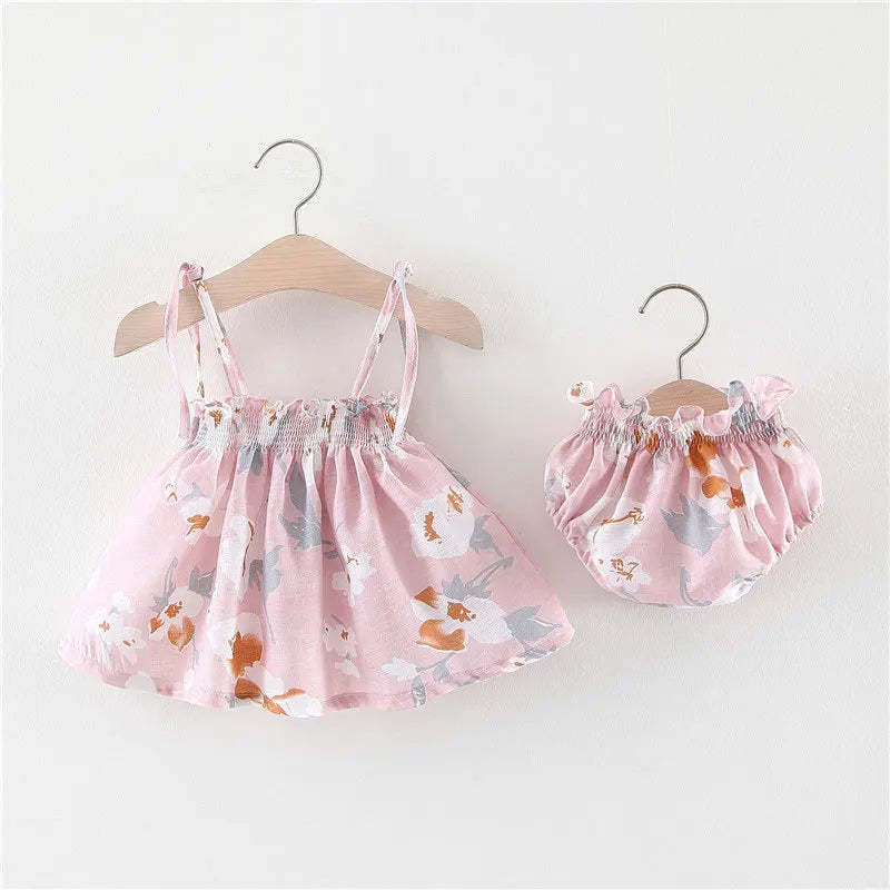 Design Details: Flared dress with adjustable straps and elastic waistband bloomers for easy wear.