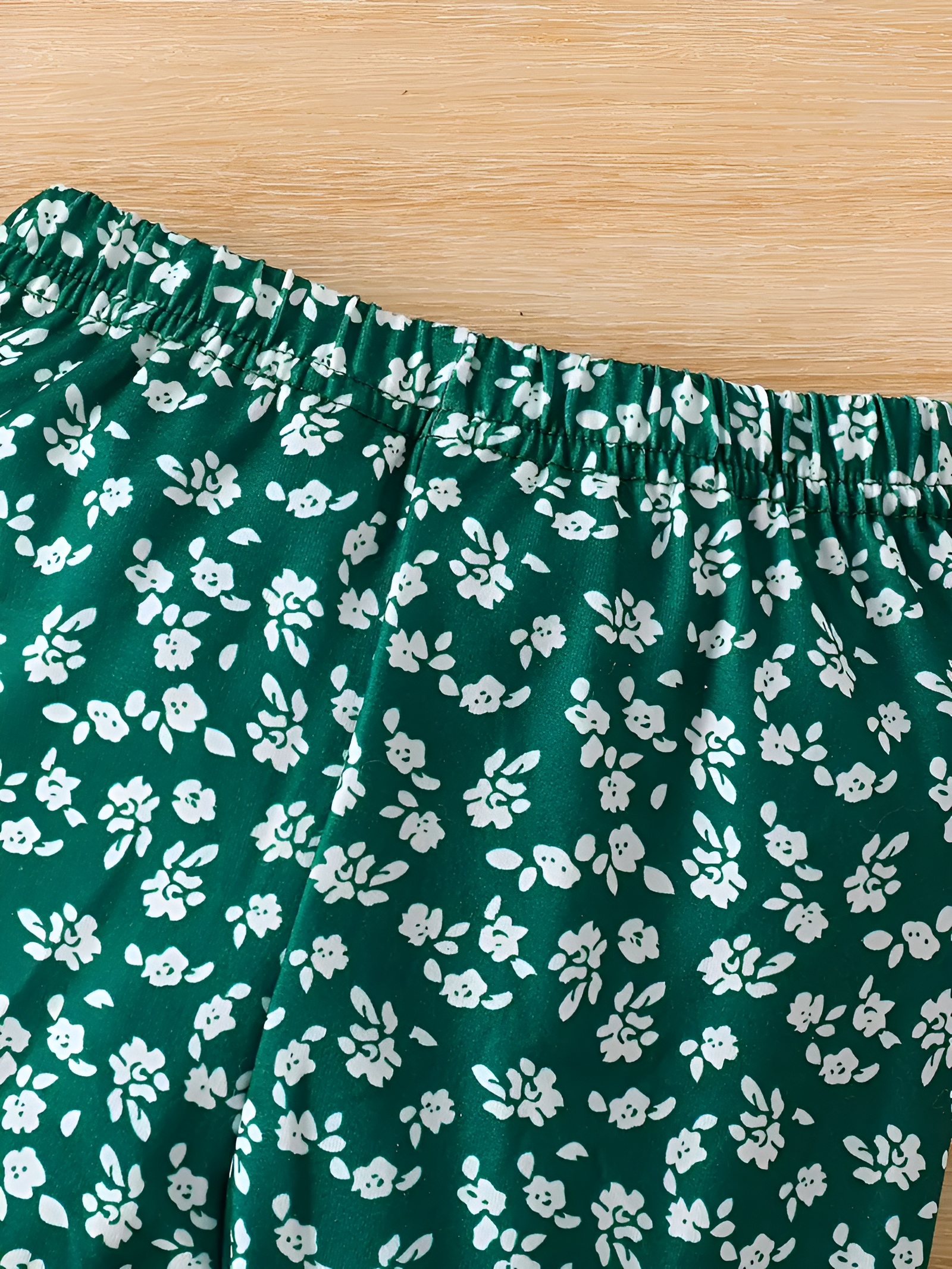 The green floral pattern contrasts beautifully with the white top, creating a balanced yet eye-catching look. Its lightweight fabric makes it a reliable option for warm climates, while the stitched seams and color-fast print ensure long-lasting wear.