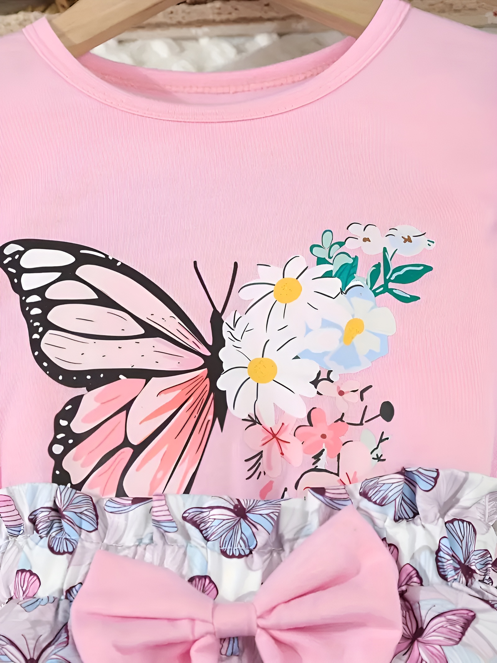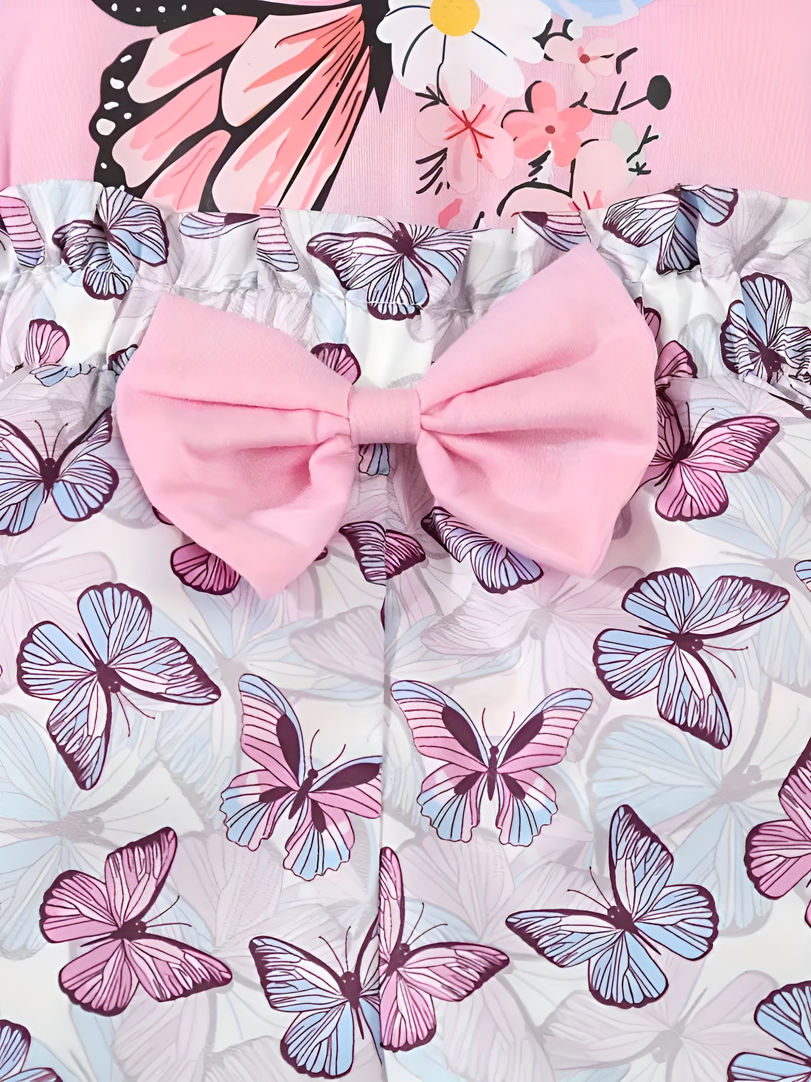 This Butterfly And Floral Print Top And Shorts Set For Girls is versatile and can be worn for various occasions—whether at the park, a family picnic, or an outdoor adventure. The puff sleeve design and bow detail add a girly flair, while the crew collar offers a classic and comfortable fit. With its easy care instructions and material, this Butterfly And Floral Print Top And Shorts Set For Girls will be a wardrobe staple all summer long.