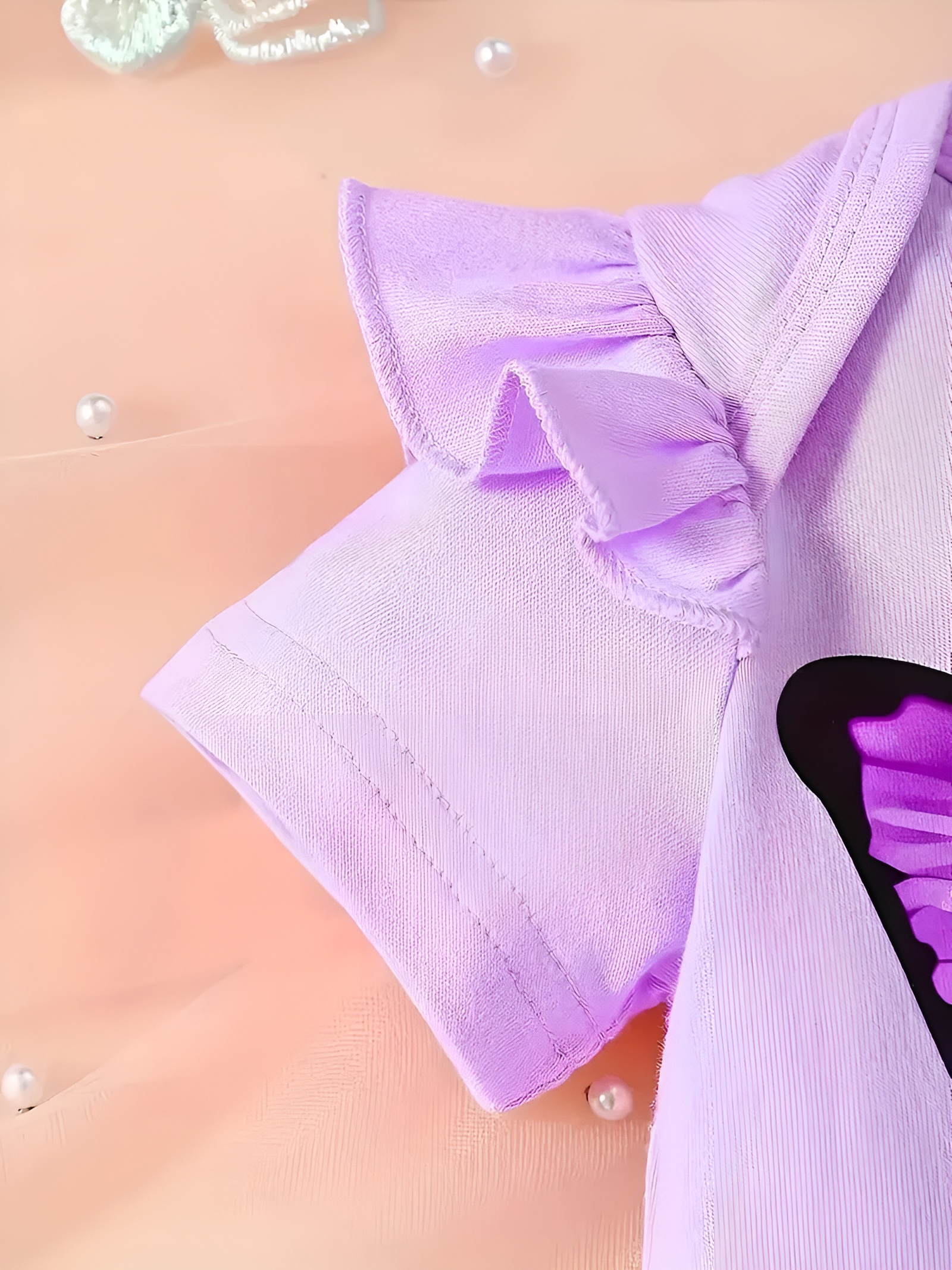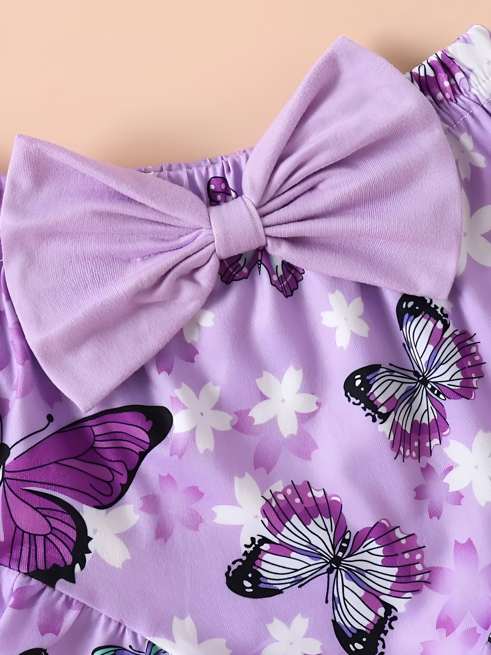 - Butterfly Print Bodysuit: The round collar bodysuit features a vibrant butterfly print, adding a cheerful look to the outfit. It's designed to be lightweight and airy for hot days.