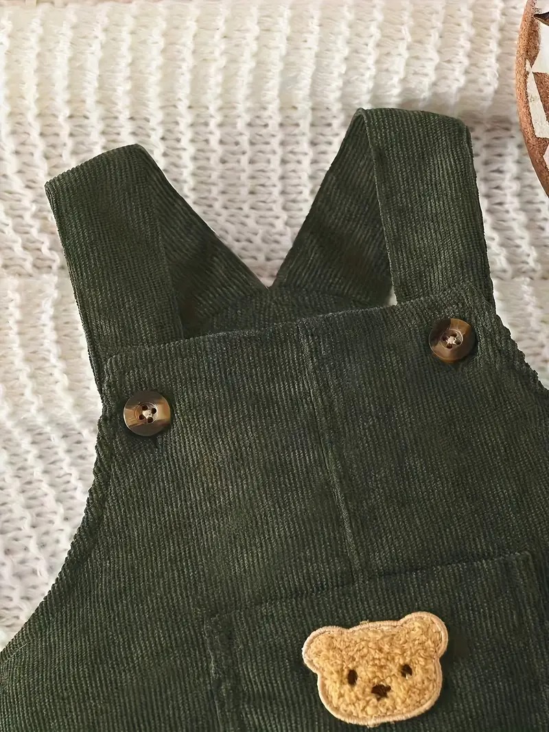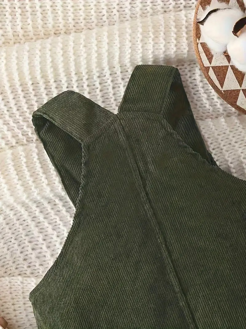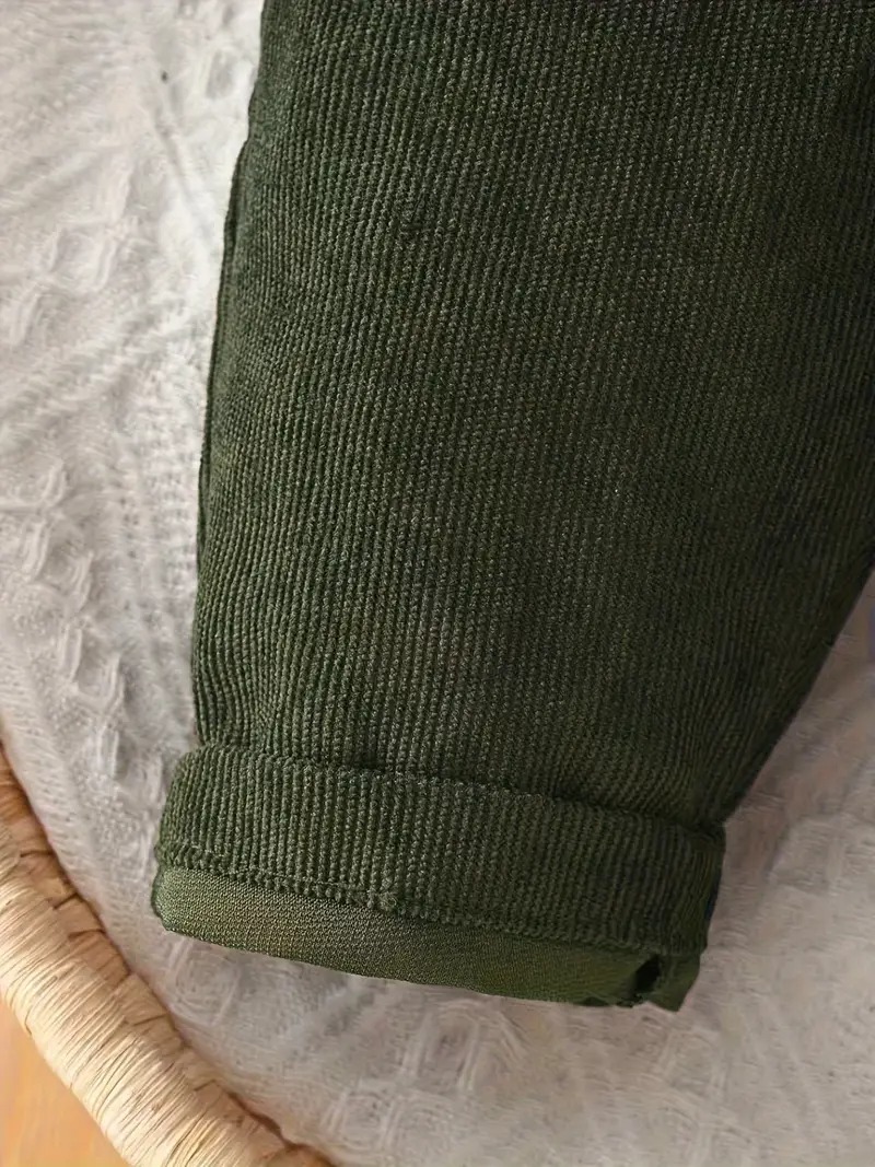 Designed for boys aged 0–3 years, this outfit is suitable for layering with shirts or sweaters during the transitional seasons of spring and fall. The woven corduroy material provides structure without stiffness, ensuring ease of movement while maintaining a polished look.