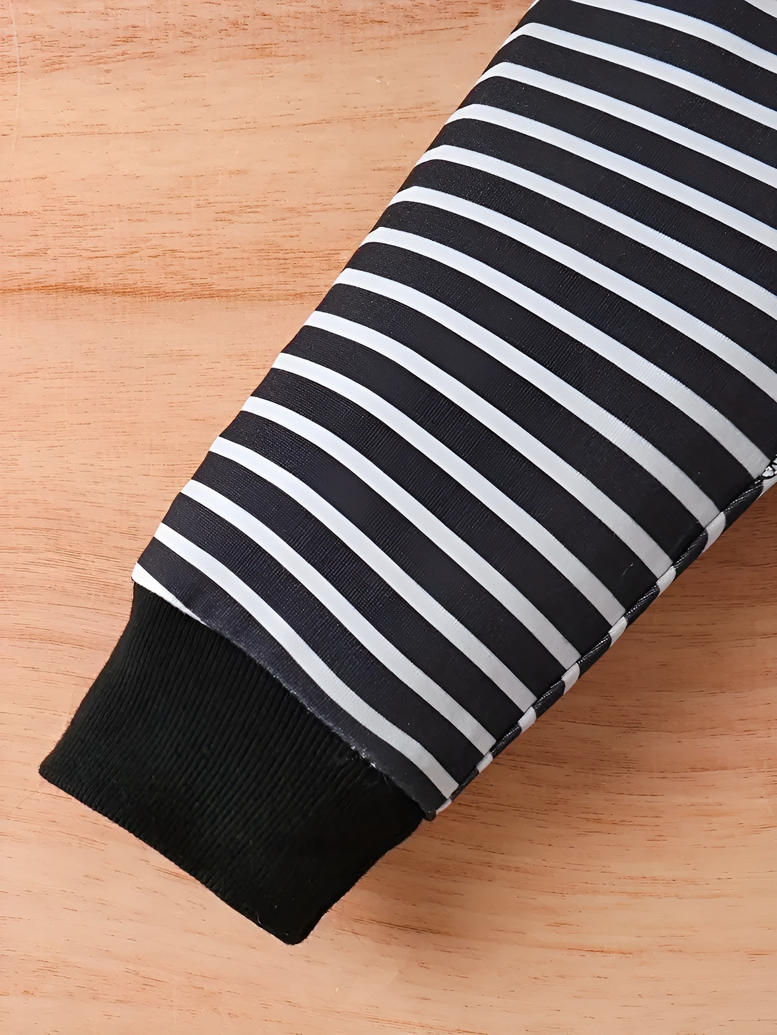 The black-and-white stripe pattern provides a timeless aesthetic that fits any occasion. The sweatshirt’s pullover design and the pants’ elastic waistband make it easy to dress your little one quickly, saving time for busy parents.