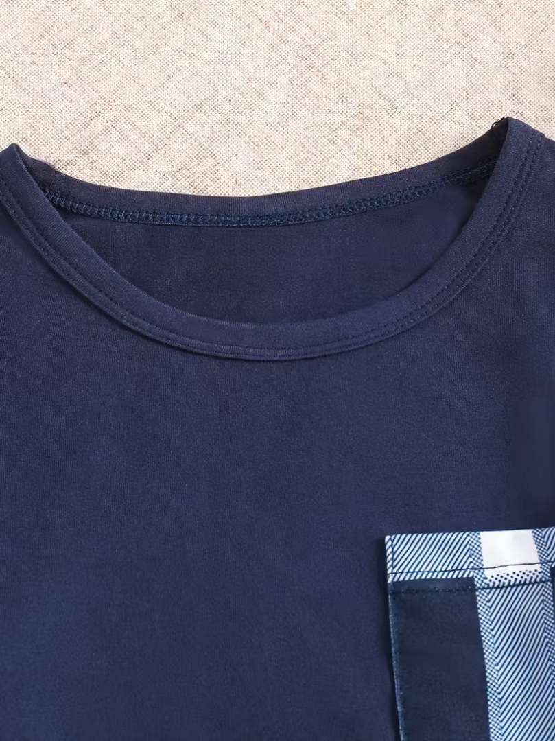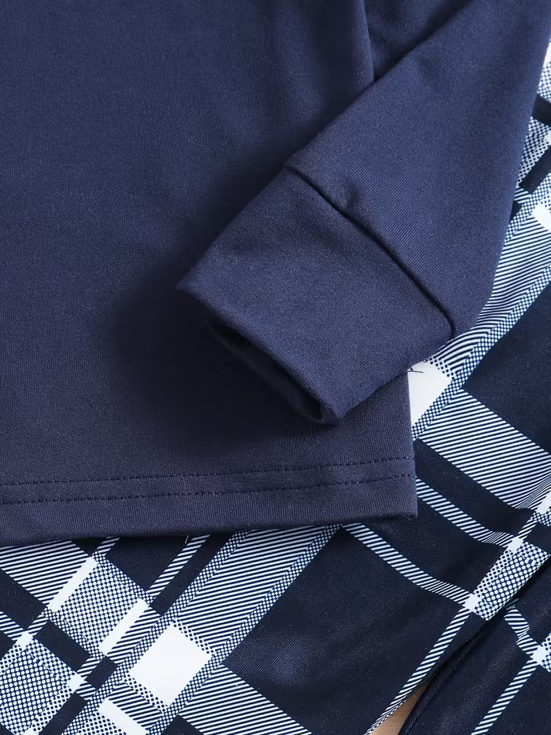 The plaid pattern on the pants adds a neat and timeless appearance, while the solid-colored top with a small pocket detail complements the look. The design ensures ease of movement, allowing children to stay comfortable during playtime, reading, or sleep. Designed with consistent quality and attention to detail, this set is a dependable choice for daily wear at home or while unwinding indoors.