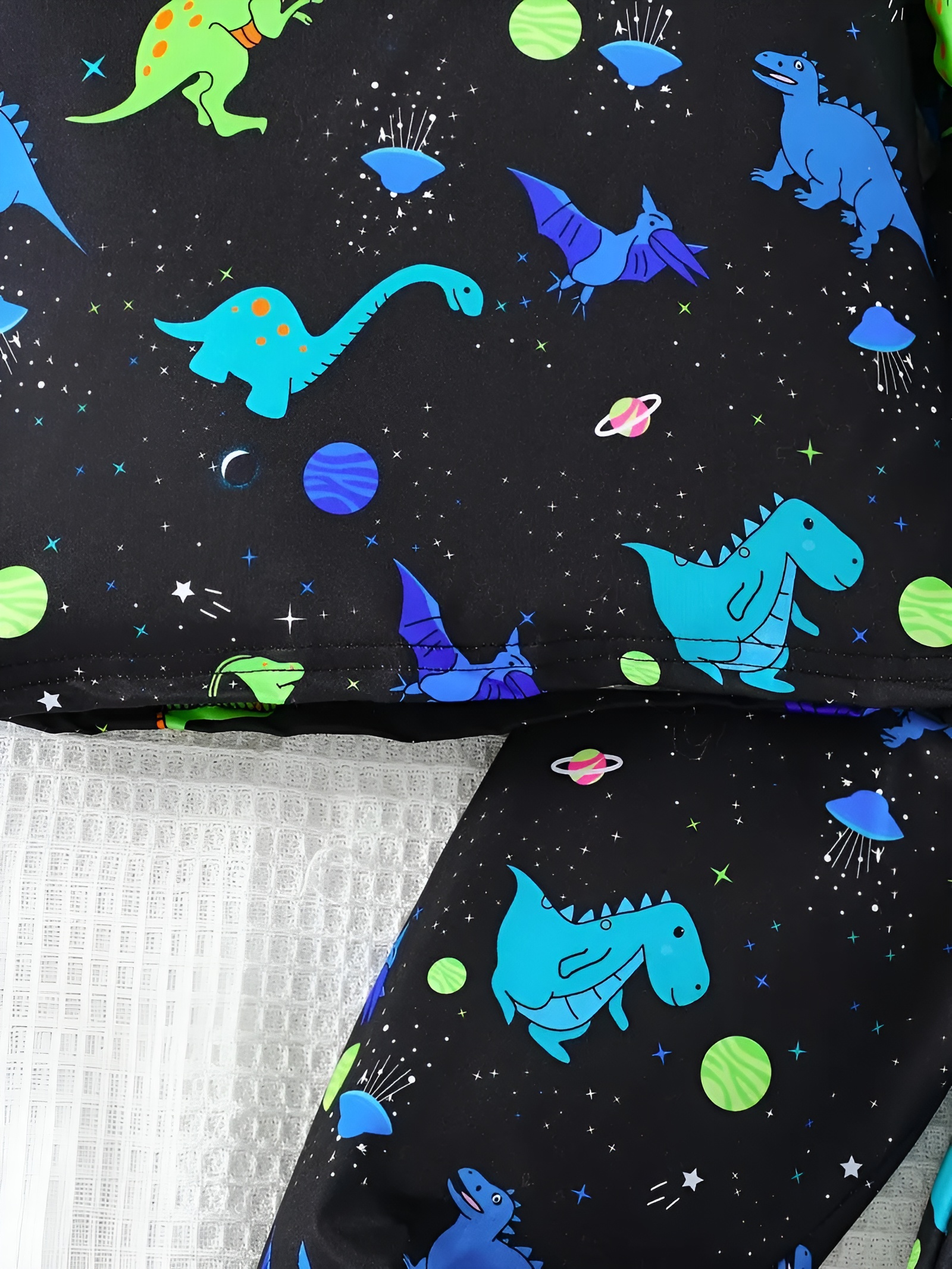 - Glow-in-the-Dark Design: One of the standout features of these Dinosaur Printed Pajama Set For Boys is their glow-in-the-dark capability. The dinosaur designs on the tops light up in the dark, making a fun and exciting experience for your child. Whether it's for a sleepover or just a cozy night at home, the glow adds a feel of magic to their pajamas.
