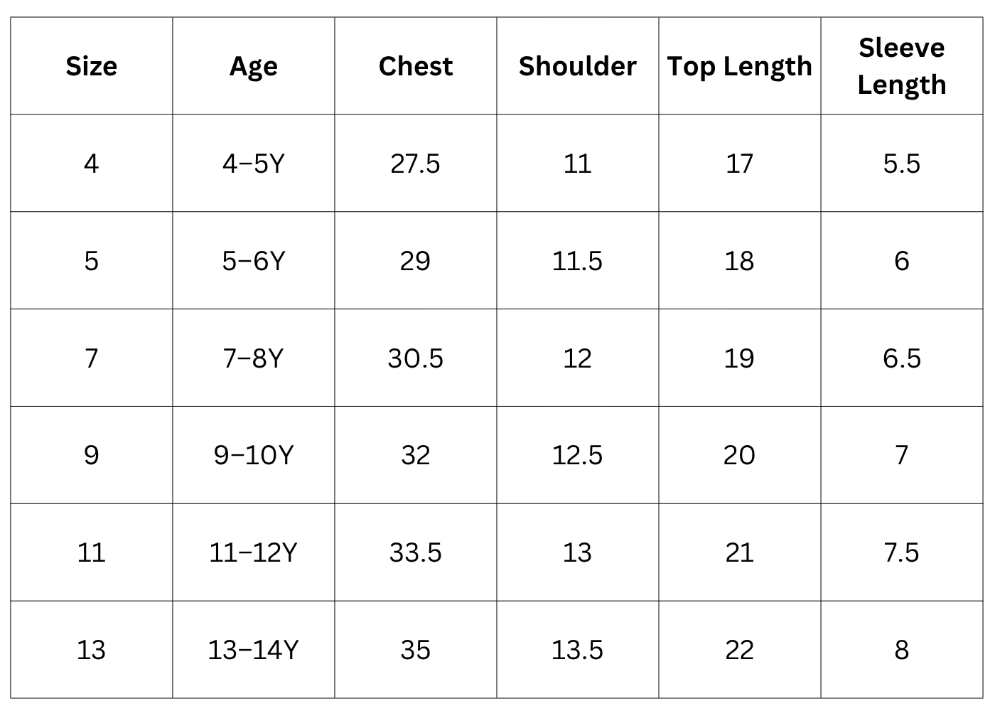Size Chart (inches):