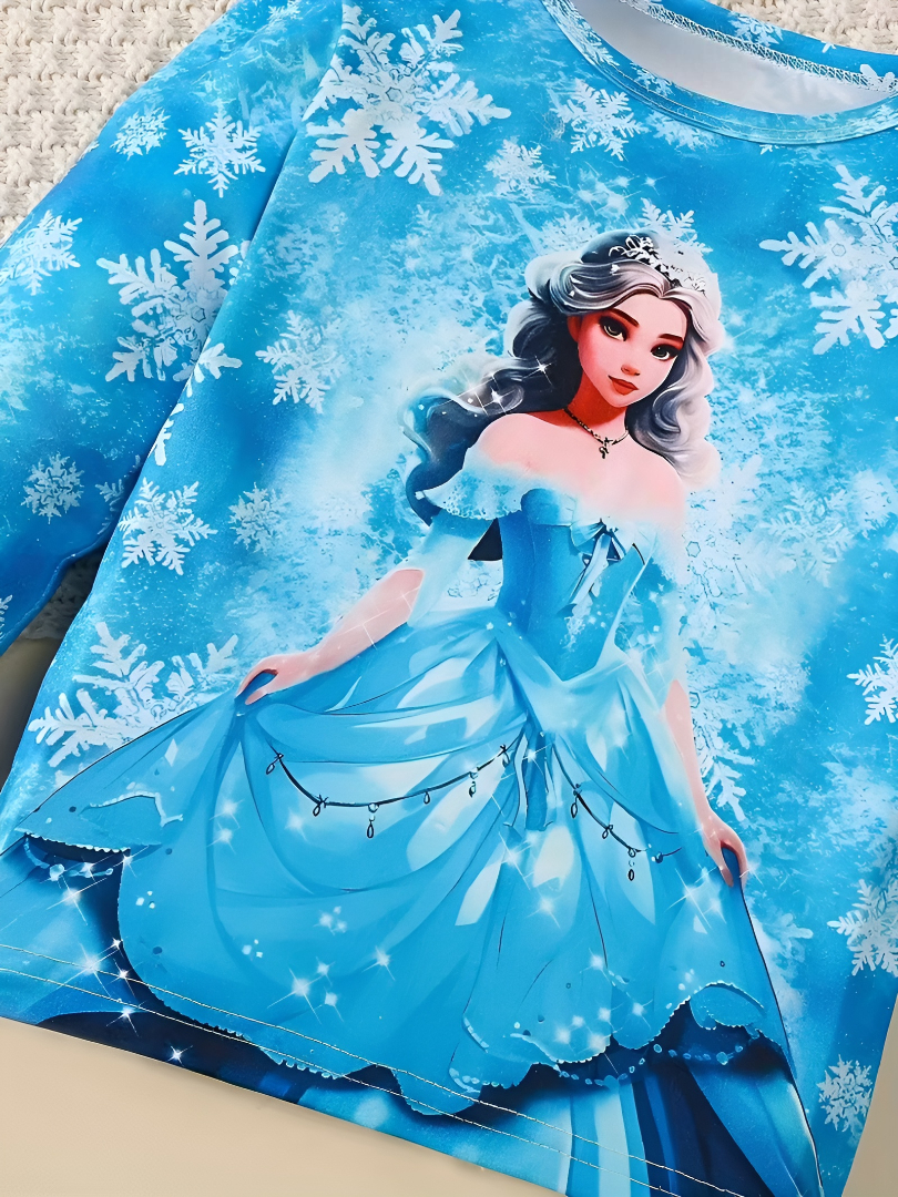The Ice Princess Pajama Set is a coordinated two-piece children’s outfit featuring a printed winter theme. Designed for everyday indoor use, it includes a long-sleeve top and matching full-length bottoms. The set maintains structure and ease of movement while featuring a consistent snowflake pattern and printed character illustration.