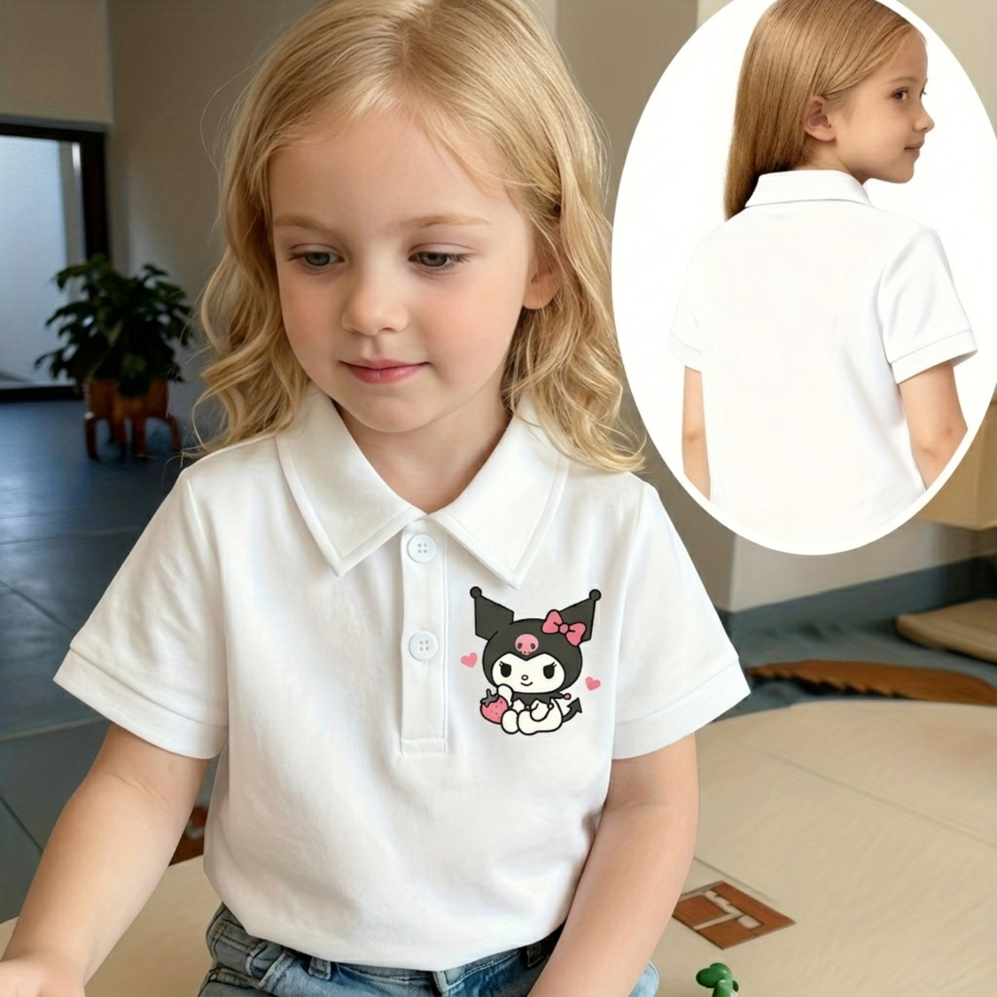 The Kuromi Cartoon Graphic Print Summer Loose Fit Polo T-shirt for Girls offers a balance of whimsical design and classic polo styling. With its double-sided print, lightweight fabric, and easy fit, it works well for daily wear as well as special occasions. This shirt provides a stylish and practical option for girls who enjoy expressive clothing.