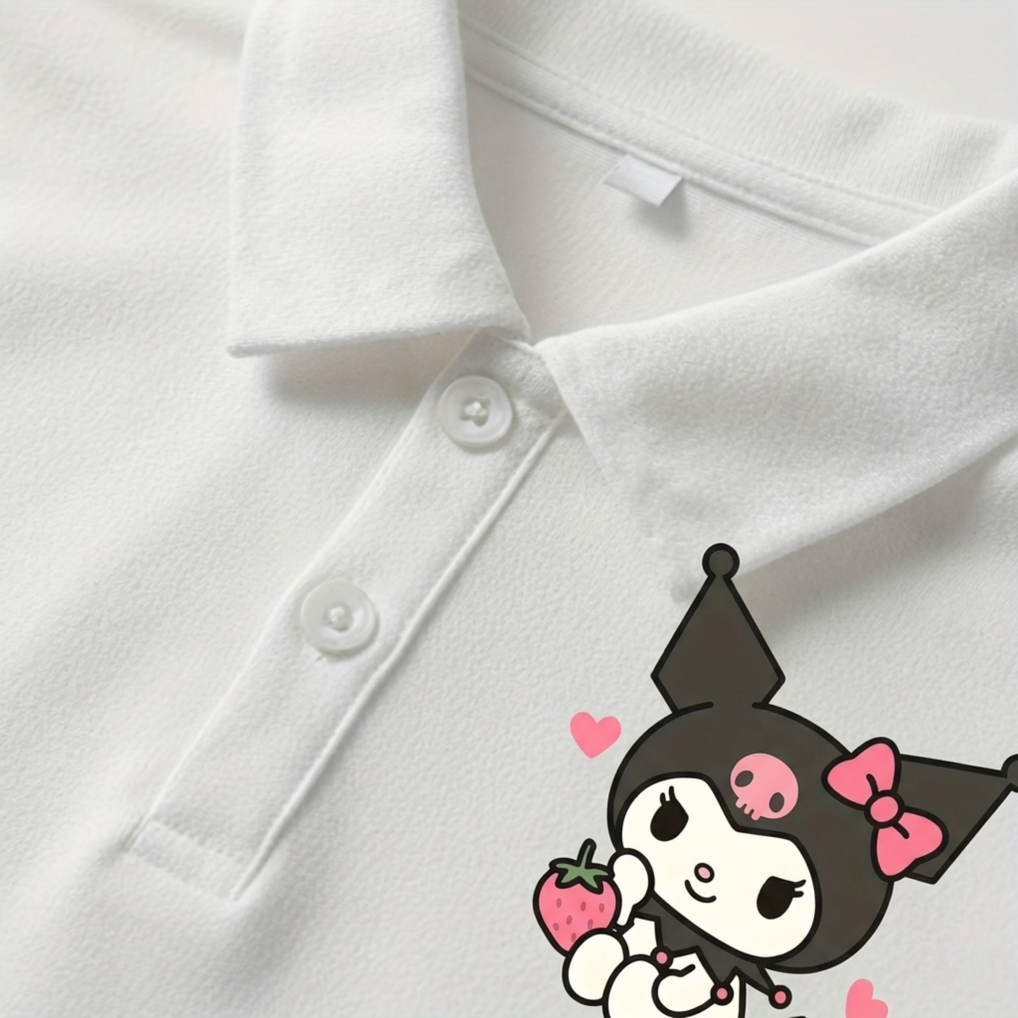 This Kuromi Cartoon Graphic Print Summer Loose Fit Polo T Shirt For Girls combines whimsical cartoon graphics with a structured polo design. The double-sided print adds visual interest, giving the shirt a standout appearance from both front and back. The short sleeve construction and lapel collar provide a classic look, while the graphic detail brings a fun element to everyday outfits.