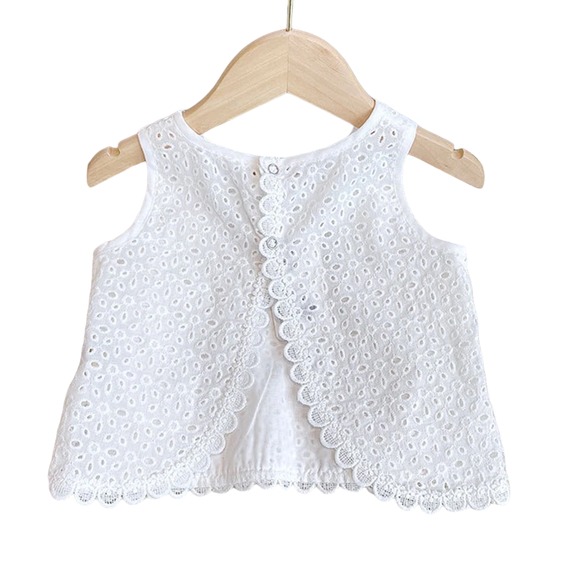 This Lace-Trimmed Sleeveless Top brings a sophisticated touch to your youngster's wardrobe with its delicate lace trim and timeless button details. Ideal for warmer weather, it's a piece that pairs easily with a variety of bottoms, making it a versatile choice for any casual gathering or day out.
