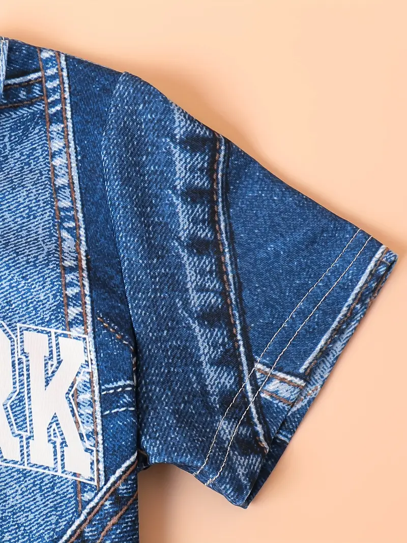 Letter Imitation Denim Summer Printed Set For Baby Boy. Imitation denim texture, easy-care construction, and vibrant top design help support ease during play and short trips. Whether preparing for a morning activity or heading out for a quick outing, this set offers readiness and simplicity in one.