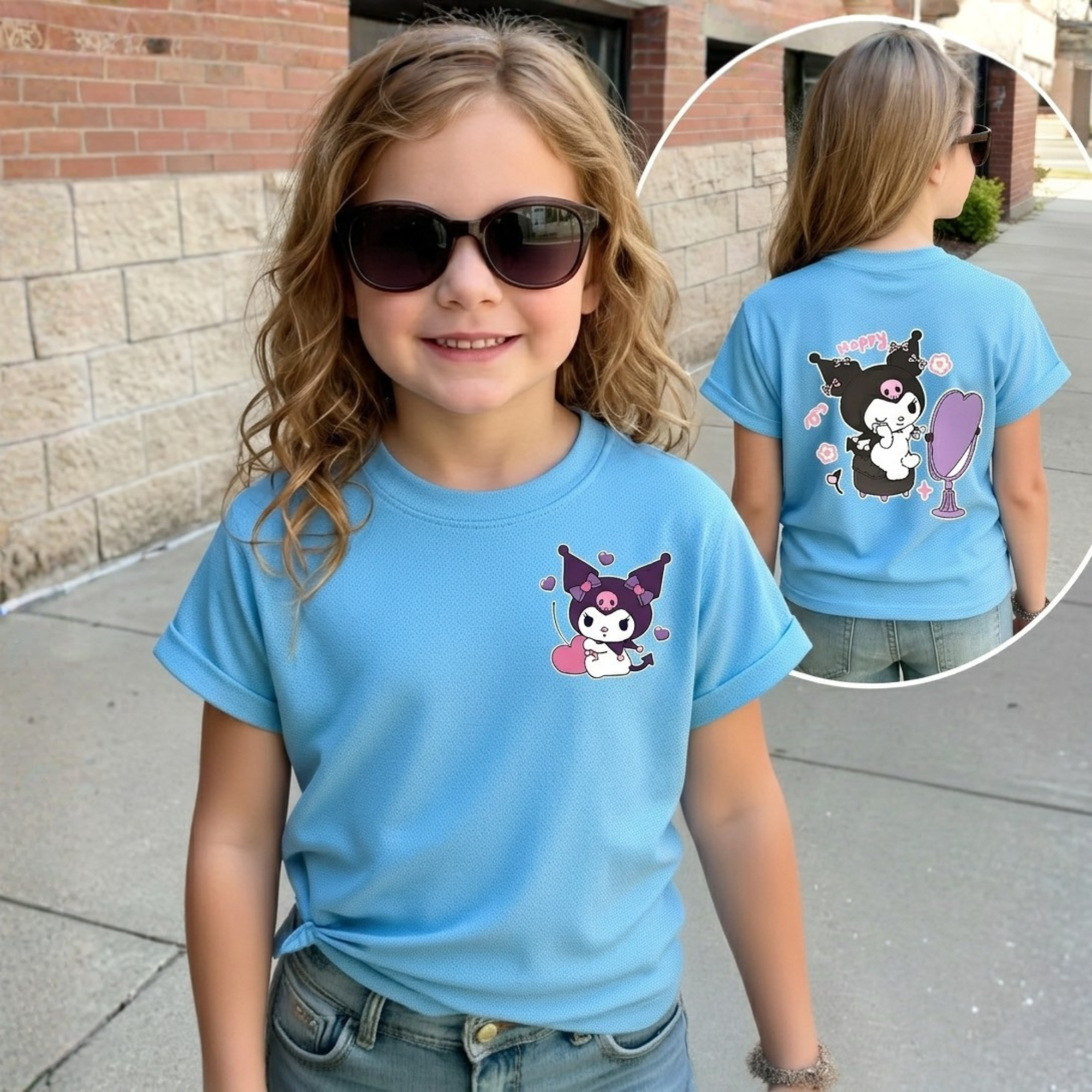 A stylish and comfortable tee that blends design with everyday practicality for versatile casual wear. Mesh Short Sleeve T-shirt with Double-Sided Kuromi Printed For Girls is a lightweight and airy casual option designed for comfort and style. Featuring a colorful double-sided cartoon print, it adds charm to everyday outfits. The soft mesh fabric ensures easy wear, while construction supports long-term use. Perfect for daily activities and fun occasions, it combines comfort, style, and practicality.