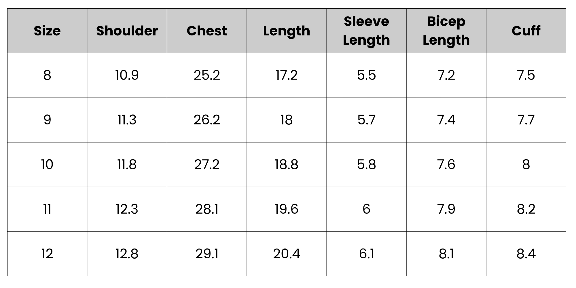 Size Chart (inches):