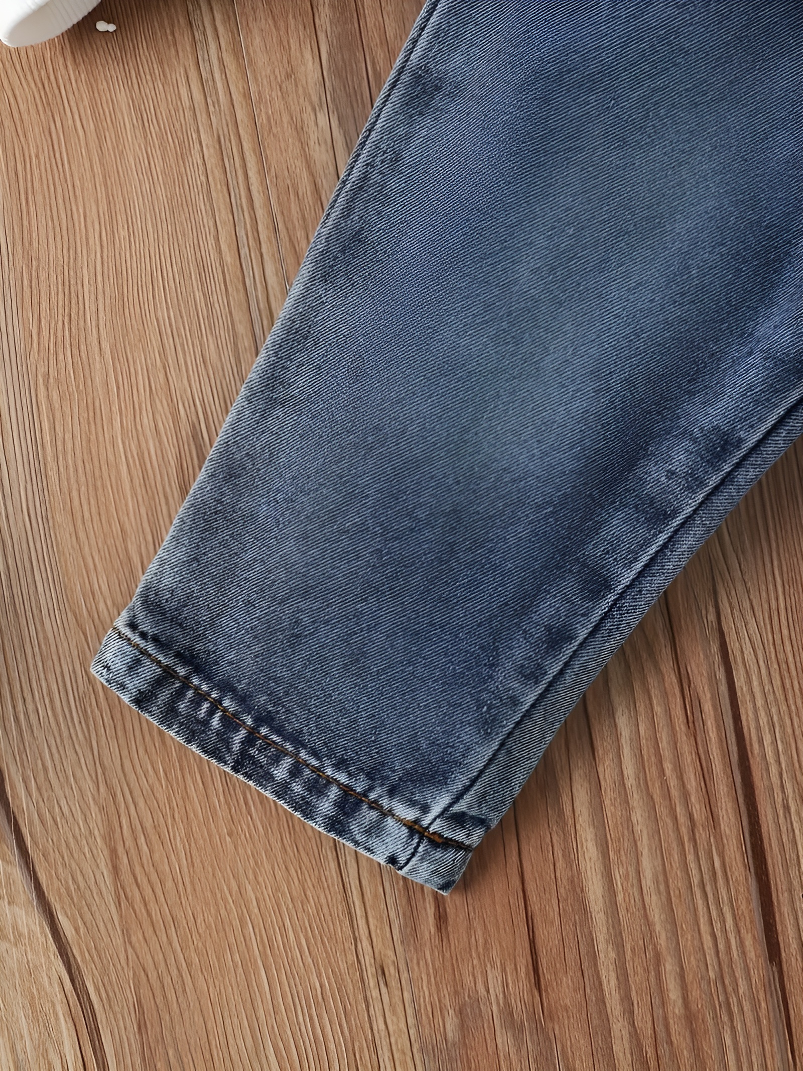 Its mix of texture—soft knit cotton and structured denim—creates a balanced look that’s both fashionable and functional. This outfit’s robustness and design make it an ideal option for growing children who need easy-to-wear, easy-to-care-for clothing.