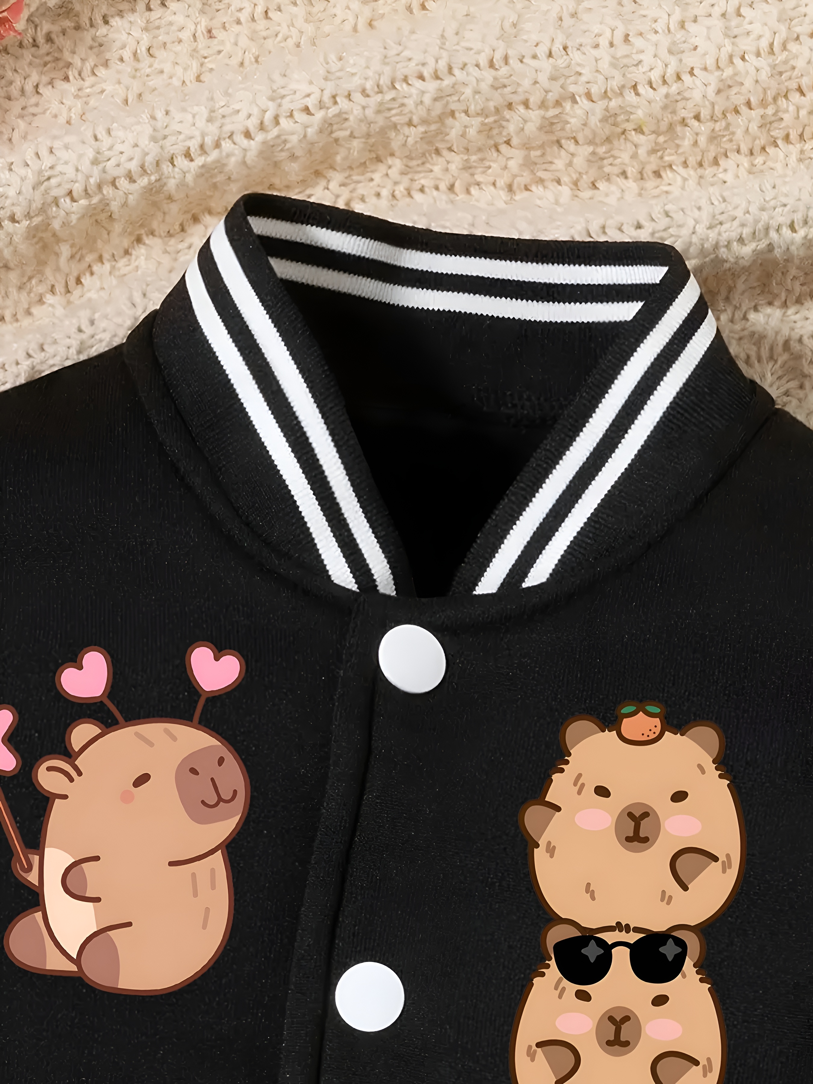 Stylish Capybara Themed Girls Baseball Jacket For Everyday Wear is a stylish and outerwear piece designed for everyday comfort and fashion. Featuring a cartoon design and sporty style, it adds charm and personality to seasonal outfits. Stylish Capybara Themed Girls Baseball Jacket For Everyday Wear is a stylish and comfortable outerwear option featuring a cartoon design in a versatile black color. Ideal for casual wear, school, and seasonal outings, it combines soft fabric and a sporty style. This jacket adds a fun and fashionable look to everyday outfits while ensuring comfort and versatility.