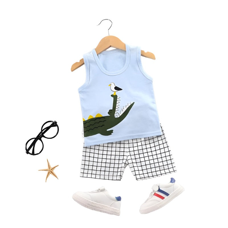 Add some fun and color to your child's wardrobe with our Summer Printed Vest Shorts Sets. Made from 100% cotton, this set features a playful animal and rainbow print on both the sleeveless top and matching shorts. Keep your child comfortable and stylish for all their adventures with this everyday must-have.