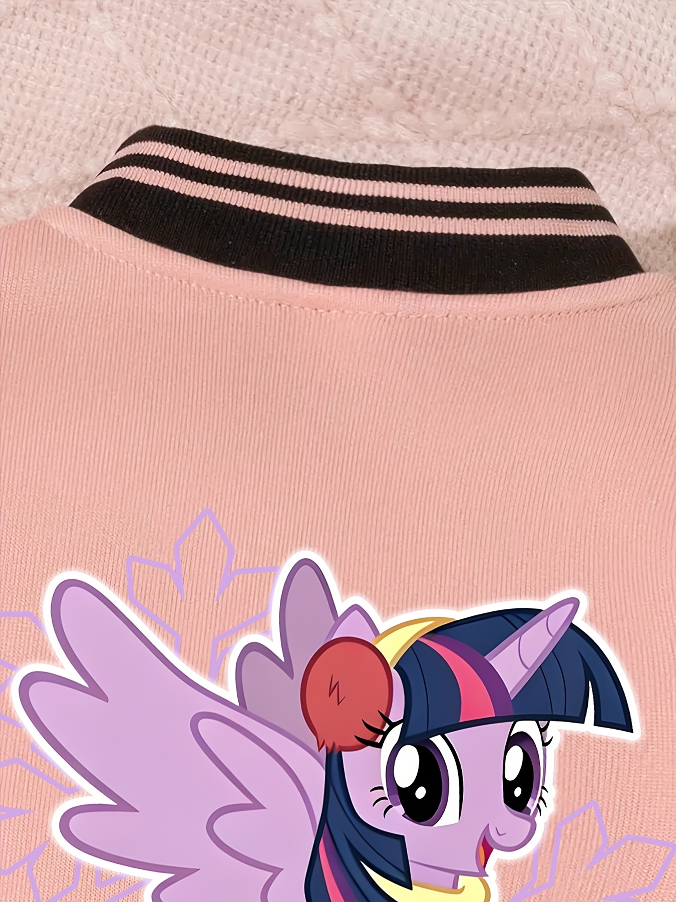 This Twilight Sparkle Cartoon Print Jacket and Flared Pants Set for Girls showcases a Twilight Sparkle cartoon print combined with a modern, casual design. The set includes a baseball-style jacket and flared pants, offering a coordinated outfit suitable for everyday wear and special occasions. The multi-print design adds a cheerful visual element, making it a standout option for seasonal styling.