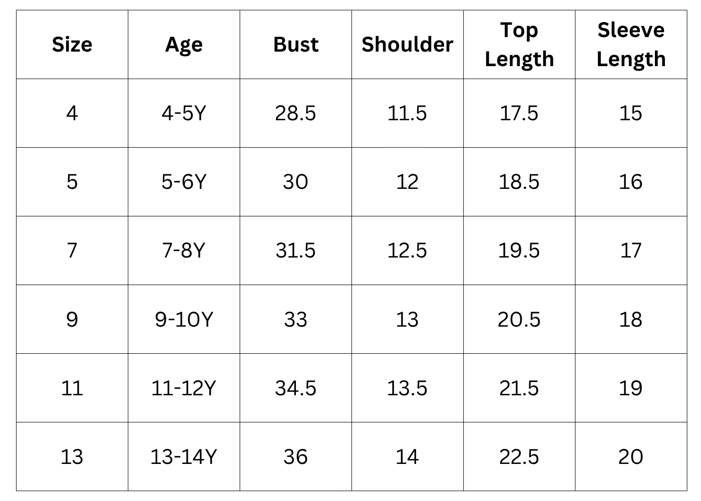 Size Chart(inches):