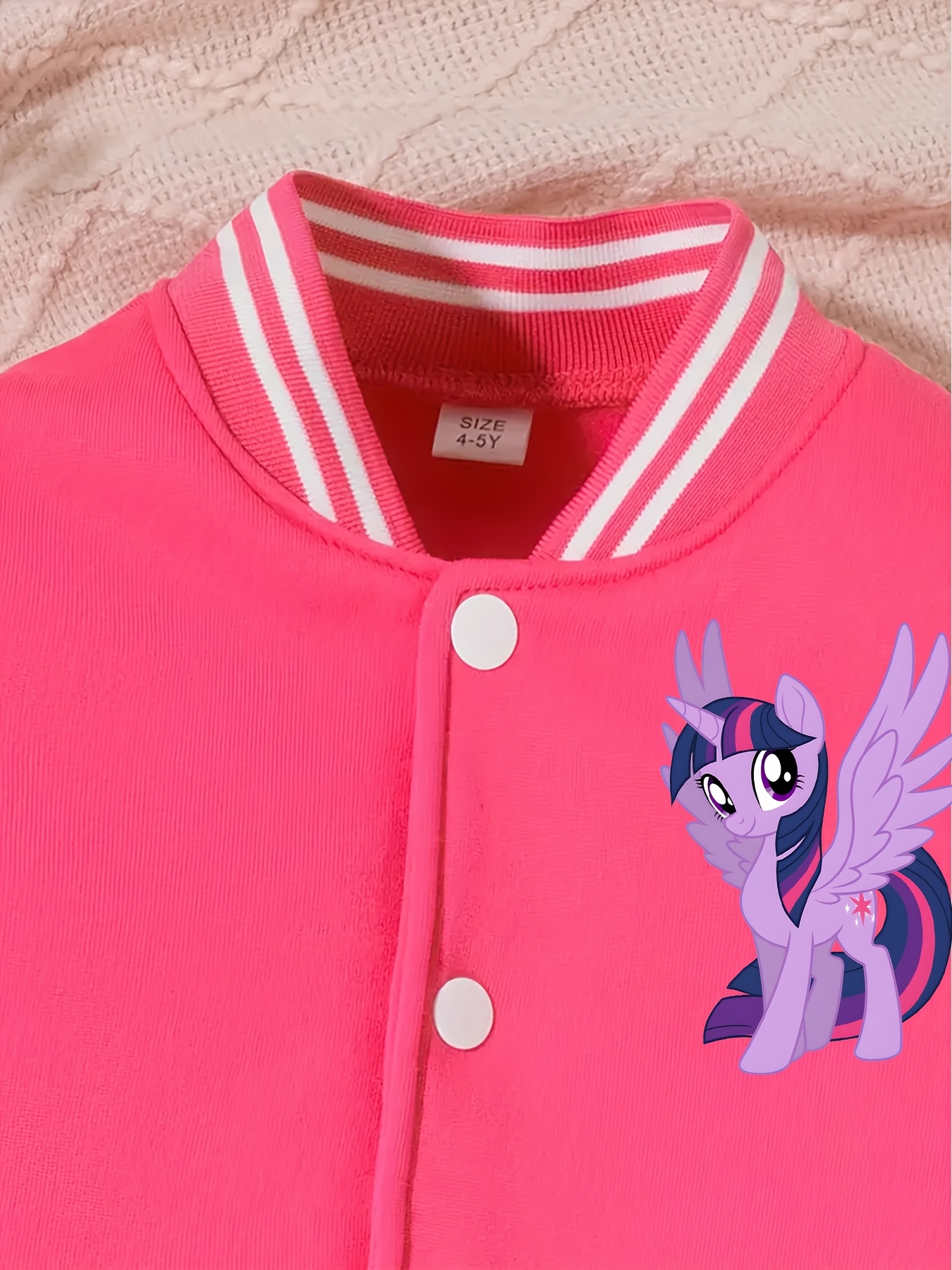 This Twilight Sparkle Themed Jacket And Flared Pants 2 Piece Set For Girls showcases a Twilight Sparkle themed design that blends whimsical graphics with a modern, casual look. The set includes a short baseball-style jacket and flared pants, creating a coordinated outfit that is easy to wear for multiple occasions. The vibrant cartoon print adds a standout visual element while maintaining a practical everyday style.