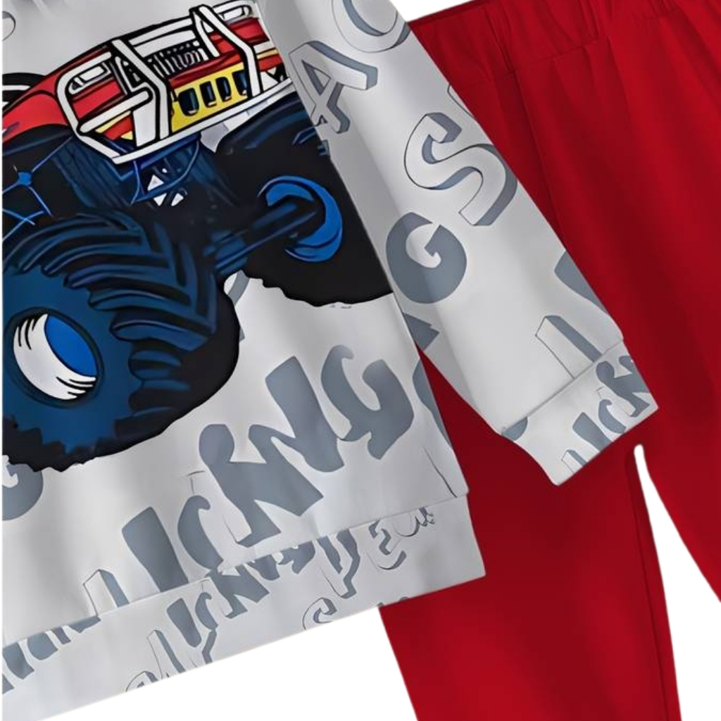 This Two Piece Car Graphic Printed Hoodie And Jogger Set For Kids follows a standard outline. It avoids being overly close. The pants maintain a straight silhouette, while the top complements without excess fabric.